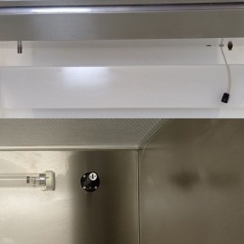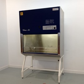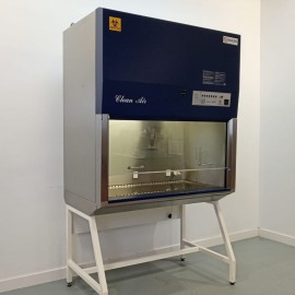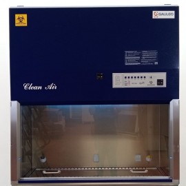 Refurbished Clean Air EF/A4 biosafety cabinet. Class II. Prefilter and two HEPA filters H14 99.99 percent efficiency at 0.3 um. White and UV lamp. Vertical laminar flow. Air circulation 70 percent recirculated 30 percent exhausted. Operator, product, environment protection. Steel material. Includes two electrical outlets, vacuum and gas connections, support base. Exterior dimensions 1350 x 850 x 2260 mm, weight 250 kg.
