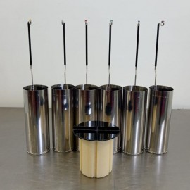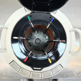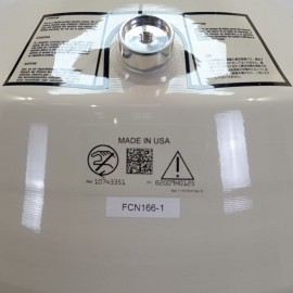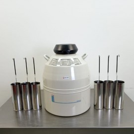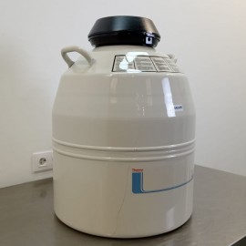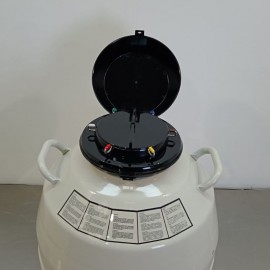 Thermo Scientific BioCane 47 cryogenic container refurbished. Manual LN2 filling type. Capacity 47.4 L. Vacuum insulation. Static evaporation rate 0.39 L/day. Static hold time 121 days. Aluminum material. Includes six baskets. Capacity of 42 straws per basket, holding 1,500 to 2,500 cryovials in total. External dimensions (diameter*height): 50.8 x 63.3 cm; neck 12 cm. Weight 22 kg.