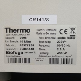 Thermo Biofuge Primo R Centrifuge. Refrigerated. Temperature range from -9°C to 40°C. Maximum speed (depending on rotor) of 15,000 rpm. Includes 7591 floating rotor with four 7555 vessels with lid and adapters for 3 15 mL Falcon-type tubes, with maximum speed 4000 rpm. Microprocessor control with touch keyboard. Variable speed/RCF/time control. Short braking and acceleration times. Maintenance-free brushless induction motor. Silent operation < 62 dB. User manual.