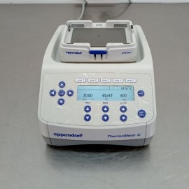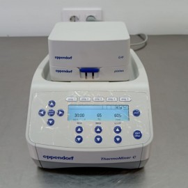Refurbished Eppendorf ThermoMixer C Thermomixer. Temperature range 15 degrees below ambient temperature up to 100 degrees. Agitation speed 300 to 3000 rpm. Agitation diameter 3 mm. Timer 15 seconds to 99 hours 30 minutes or continuous operation. Compatible with interchangeable Eppendorf SmartBlocks for tubes and plates from 5 µl to 50 ml. Digital display with temperature and time adjustment. Includes SmartBlock microplate block and ThermoTop lid. Original packaging, like-new equipment. External dimensions 20.6x30.4x13.1 cm. Weight 6.3 kg. Power supply 220-240 V 50/60 Hz. Power consumption 200 W.