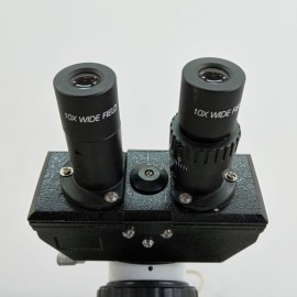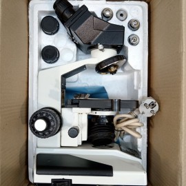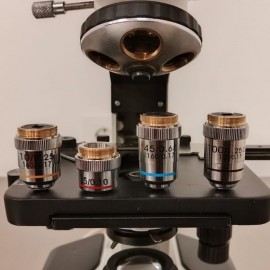 Refurbished Simtronics SE-105 optical microscope. Binocular head with 10x Wide Field eyepieces. Four objectives: 4x/0.10, 10x/0.25, 45x/0.65, and 100x/1.25 oil, mounted in a quadruple nosepiece. Mechanical stage with coaxial controls; coaxial coarse and fine focusing. Transmitted illumination via integrated halogen lamp. 160mm optical tube and 0.17mm coverslip, ideal for general viewing. Phase-free condenser; exclusively for brightfield microscopy. Rugged construction with weighted base for added stability. Dimensions: 410 x 390 x 190 mm; weight: 7 kg.