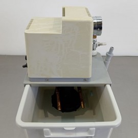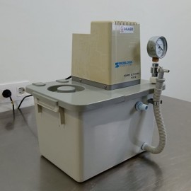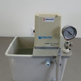 Refurbished Bioblock Scientific VE-11 Venturi type vacuum pump. Tank capacity 9.5 l. Maximum vacuum 680 mmHg. Air flow 18 l/min. Dual channel. Continuous water recirculation. Anti-backflow check valve. Lower drain valve. Exposed materials stainless steel, polypropylene, silicone, nickel-plated brass. NW25 inlet and outlet fittings. 17 mm drain tap fitting. Includes vacuum regulator gauge. Internal dimensions 298 x 210 x 227 mm. External dimensions 330 x 265 x 390 mm. Weight 5.7 kg. Electrical connection 220 V 50 Hz.