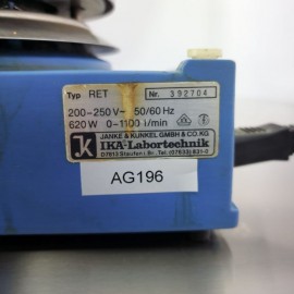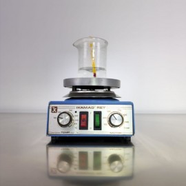 Agitador magnético aquecido IKA RET recondicionado. Faixa de velocidade 50-1700 rpm. Controlo digital de velocidade e temperatura. Faixa de temperatura ambiente até 340 graus. Temperatura máxima do fluido 270 graus. Potência de aquecimento 600 W. Precisão no ajuste da velocidade 10 rpm. Precisão da temperatura +/-1 grau. Comprimento da barra de agitação 20-80 mm. Diâmetro da placa 135 mm. Dimensões exteriores 160x85x270 mm. Peso 2,7 kg. Ligação elétrica 230V 50Hz. Consumo 600 W.