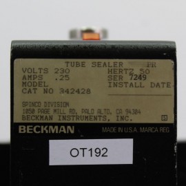 O Beckman Tube Sealer aplica calor à tampa do tubo da centrífuga para criar uma vedação hermética para armazenamento e transporte. Apresenta alguma deterioração devido a ferrugem na parte inferior que não influencia o seu funcionamento. Inclui dois racks de tubos para serem posicionados ao longo do trilho guiado para operação de maior desempenho. Tubos de ultracentrífuga de presente. Manual de usuário.